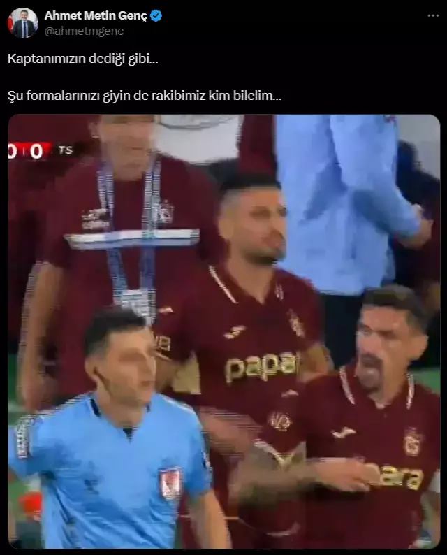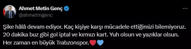 Maçın akabinde Trabzon Büyükşehir Belediye Başkanı Ahmet Metin Genç, müsabakadaki hakem kararlarıyla ilgili yaptığı paylaşımda “Şike hâlâ devam ediyor. Kaç şahsa karşı çaba ettiğimizi bilemiyoruz. 20 dakika buz üzere gol iptal ve kırmızı kart. Yuh olsun ve yazıklar olsun. Her vakit en büyük Trabzonspor” sözlerini kullandı.